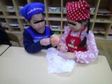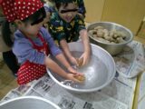 3歳児はじゃがいも洗い、4歳児は玉ねぎの皮むき、5歳児はにんじんの皮むきを担当して調理室に持っていき、カレーを作ってもらいましたよ!