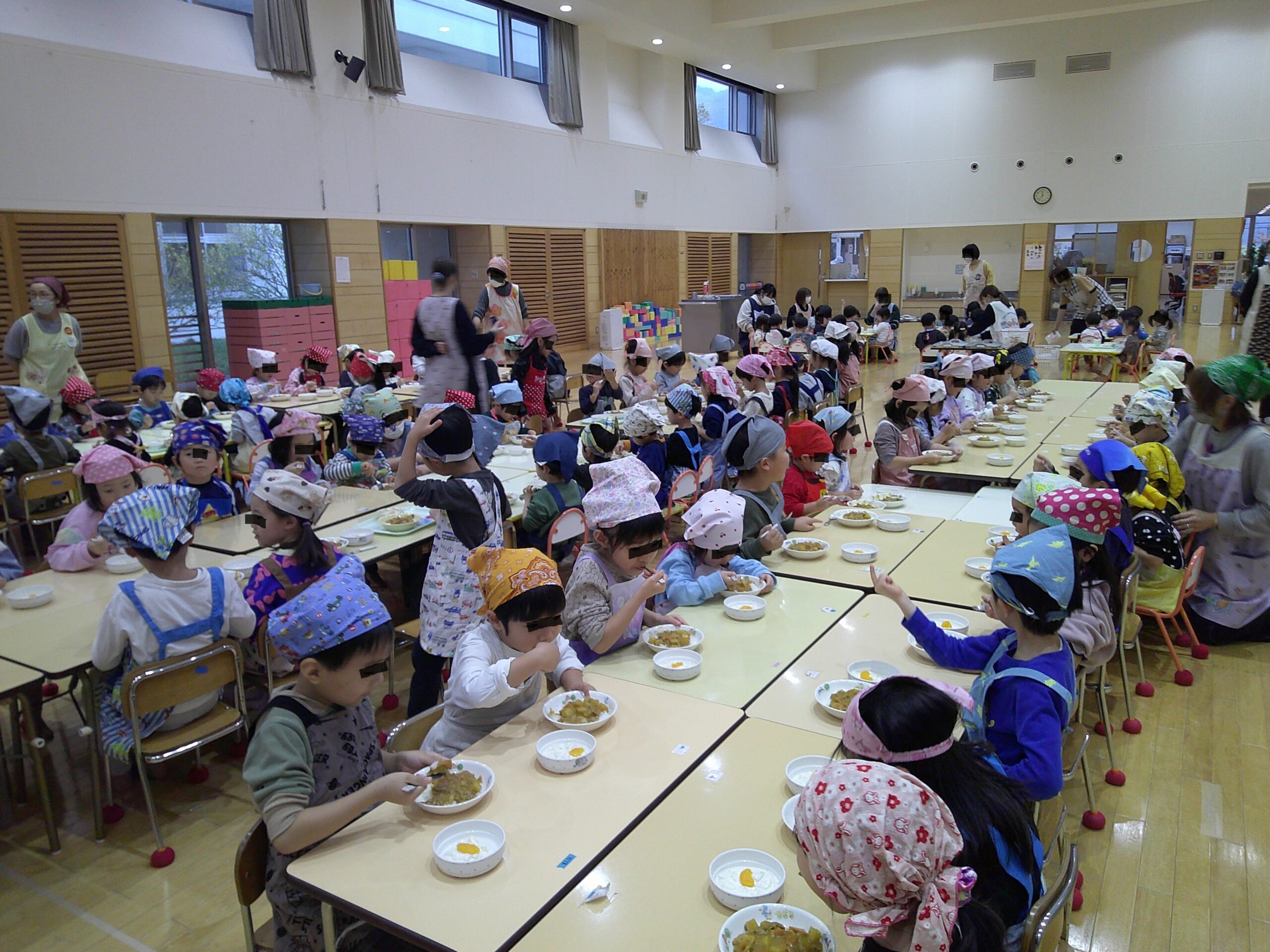 自分達で洗い、皮むきをした野菜が入っているカレーはとてもおいしかったようで、たくさんおかわりをしていました。久しぶりの異年齢グループでの食事も楽しかったようで笑顔が多くみられていましたよ!