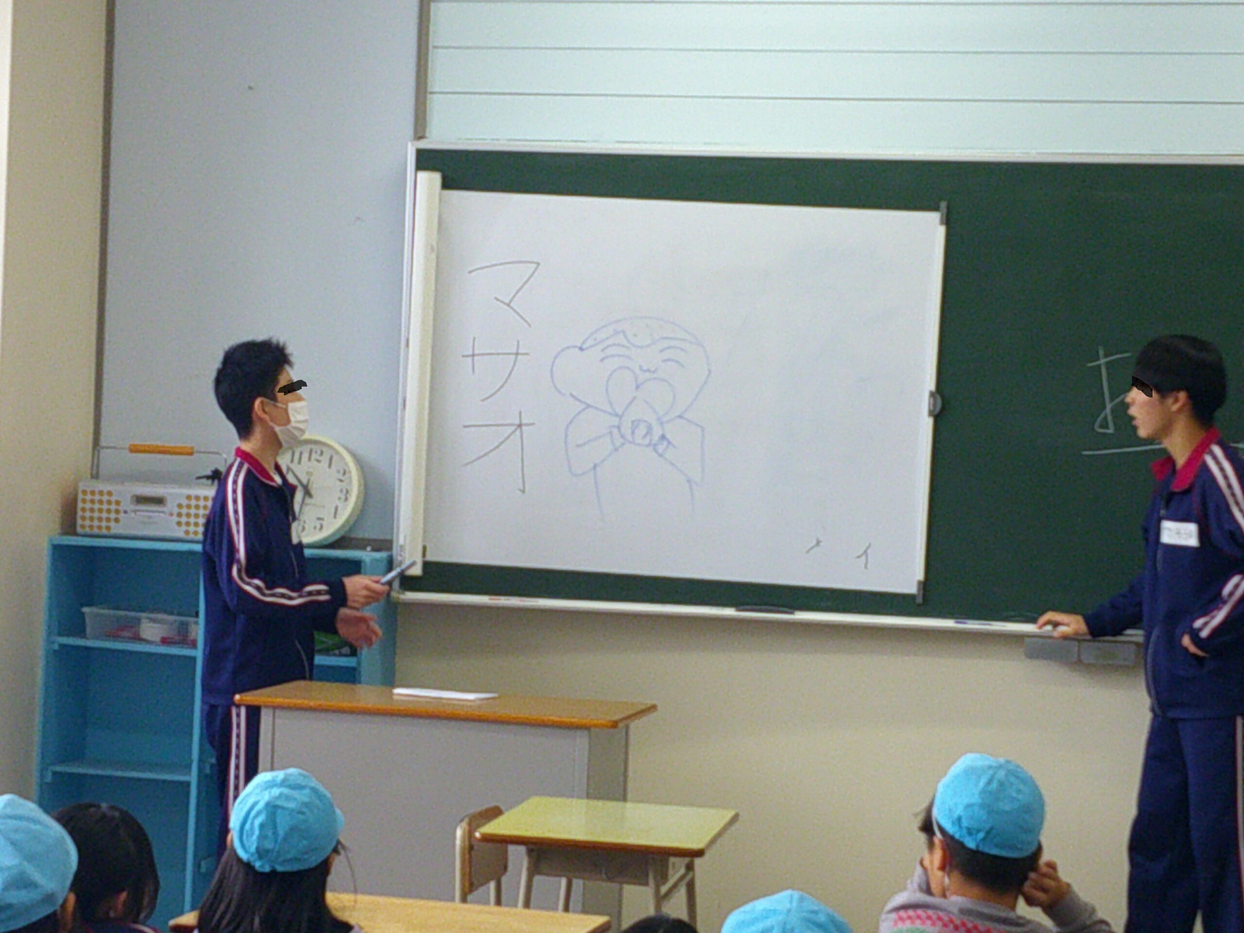 中学校に着くと、3年生のお兄さんお姉さんが出迎えてくれました。元気に挨拶をしてから、お兄さんお姉さんに手を繋いでもらい教室へ。そこでは、授業前のあいさつをしたり、ひらがな・カタカナクイズを出してくれたり、トトロの「さんぽ」を一緒に歌ったりして楽しみました。全ての計画を中学生の皆さんが考えてくれたそうです。