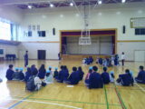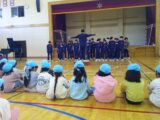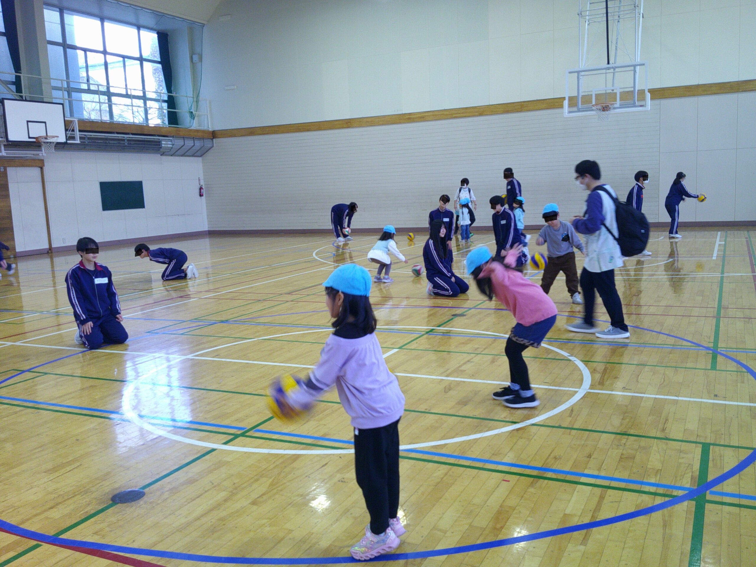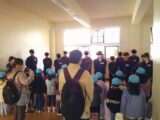 その後は体育館へ移動しました。バスケット部やサッカー部のお兄さんたちがフリースローやリフティングを披露してくれました。お兄さんたちとボール投げをして遊ばせてもらいましたよ!