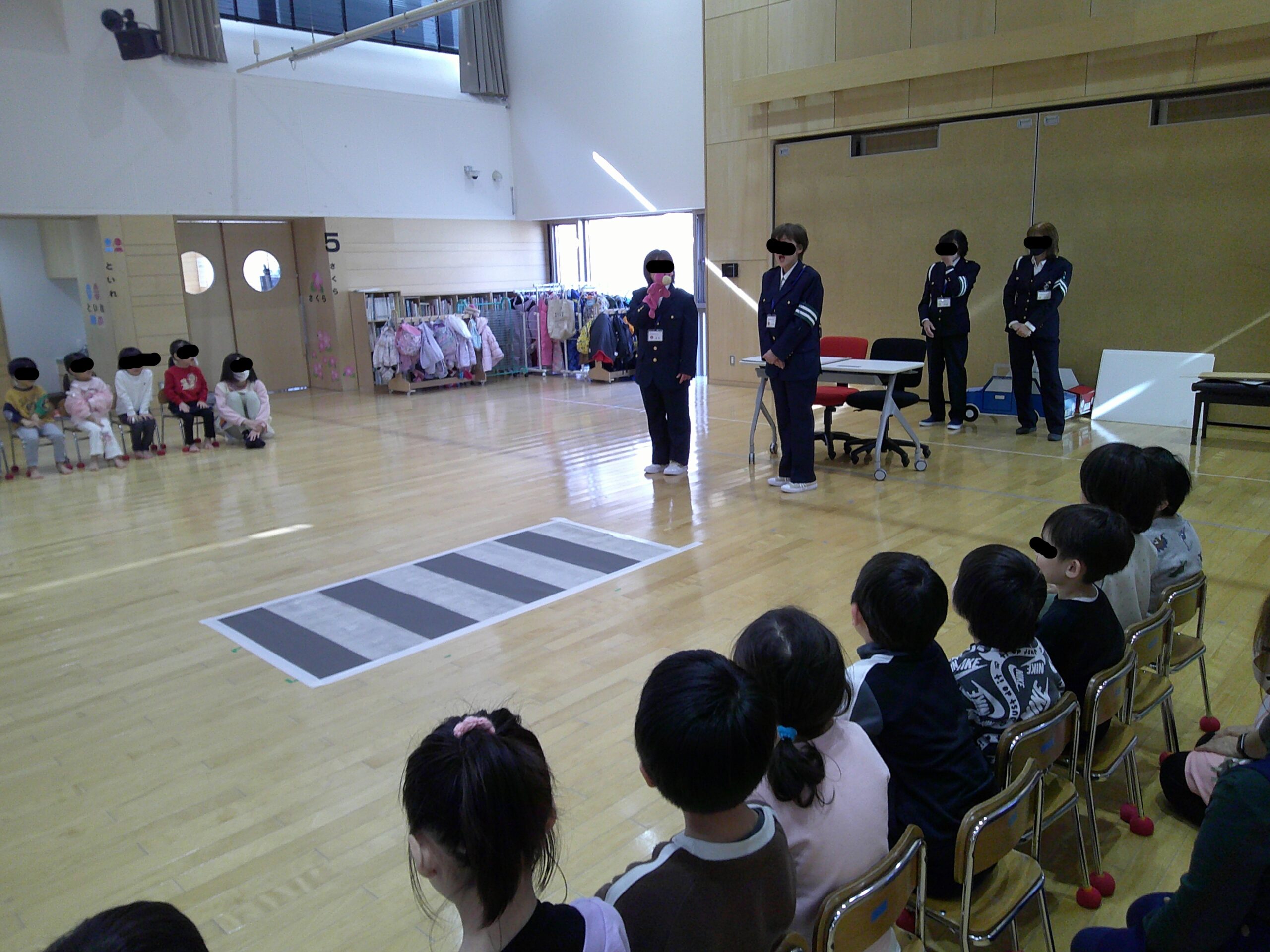 今日は交通安全指導員の方たちが来てくださり、小学校に入学するさくら組の子ども達に向けて交通安全教室が開催されました!