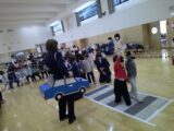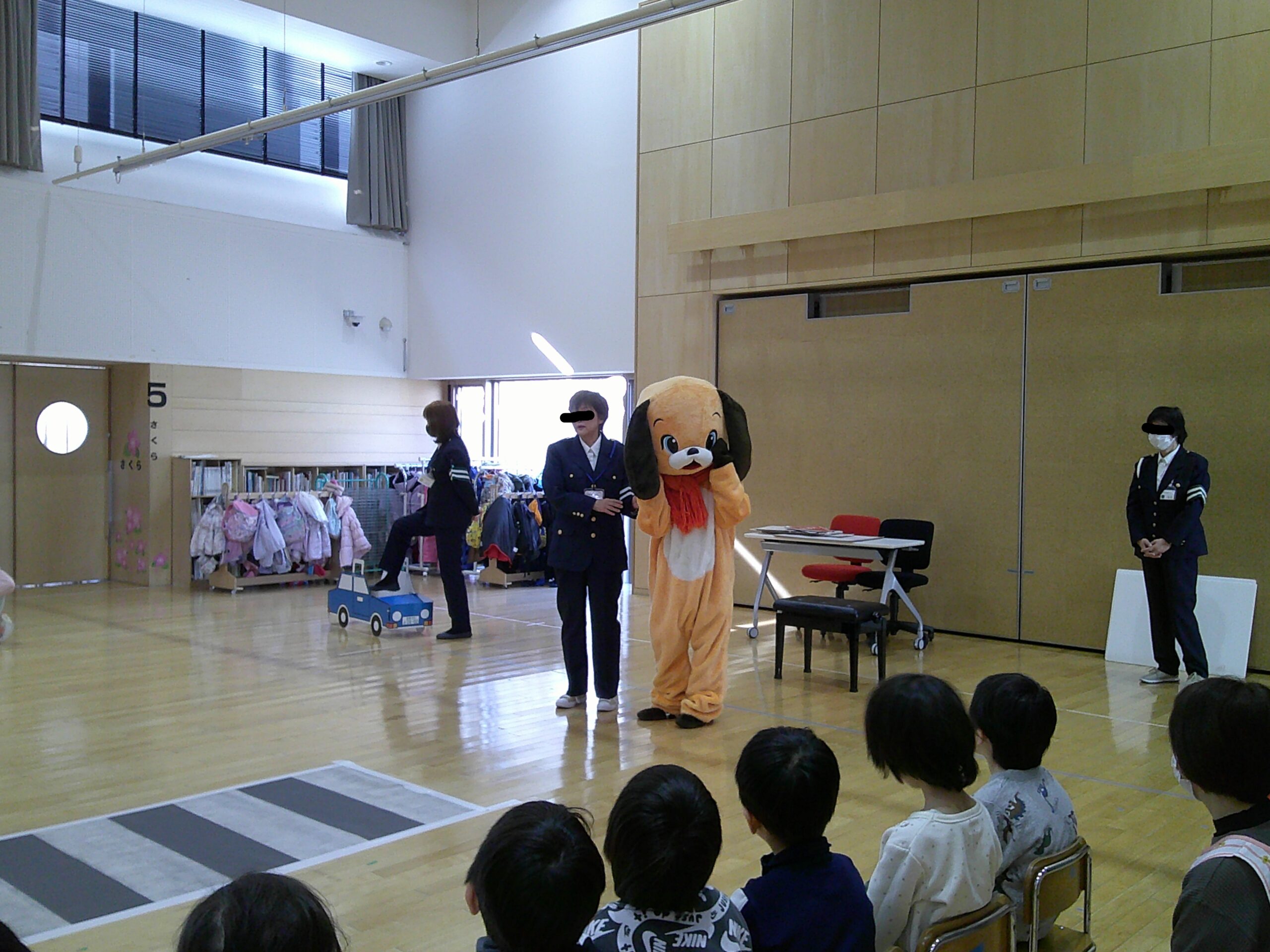 後半に犬の着ぐるみの「ジョン君」が登場し、歩道の渡り方を見せてくれました。何度か間違うジョン君が無事に成功すると、みんなで拍手!!