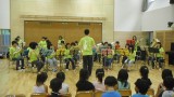 8月11日、東翔高校のブラスバンド部のお兄さん、お姉さんが来てくれました。子どもたちの大好きなアンパンマンの曲や今流行っている妖怪ウォッチの曲を演奏してくれました。曲が始まると小さい子達も踊りだしました。お返しにみんなが運動会のために練習している妖怪ウォッチの体操を踊って披露しました。高校生のお兄さん、お姉さんに大うけでした。その後、年長のさくら組さんがバルーンを披露しました。小さい子もやるもんだなぁと感心してくれました。保育園に来てもらったので0歳児から生演奏を聴くことができて、みんなとても楽しんでました。