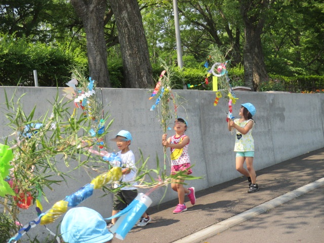 七夕地域交流 七夕です。今日は織り姫と彦星はあえるかな?作りためた笹飾りを持って保育園の迎えに住んでいる方や、地域の方を訪門しました。 みなさん子ども達の訪問を楽しみにして玄関先で待っていてくれたりします。その心遣いとっても嬉しいですね。 保育園のお隣さんの看護学校に行ったら、学生さんが笑顔で待っていてくれました。大歓迎されて子ども達も嬉しそうでした。