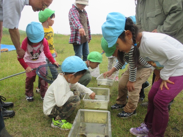 ビオトープ イタンキ浜にあるビオトープに行ってきました。あいにくの曇り空で少し肌寒かったですが、すくい網を持った子達は水の中の生き物を探そうと積極的に行動!濡れてしまったらさらに大胆になる子達もいました。捕まえた生き物を水槽に入れて観察しました。