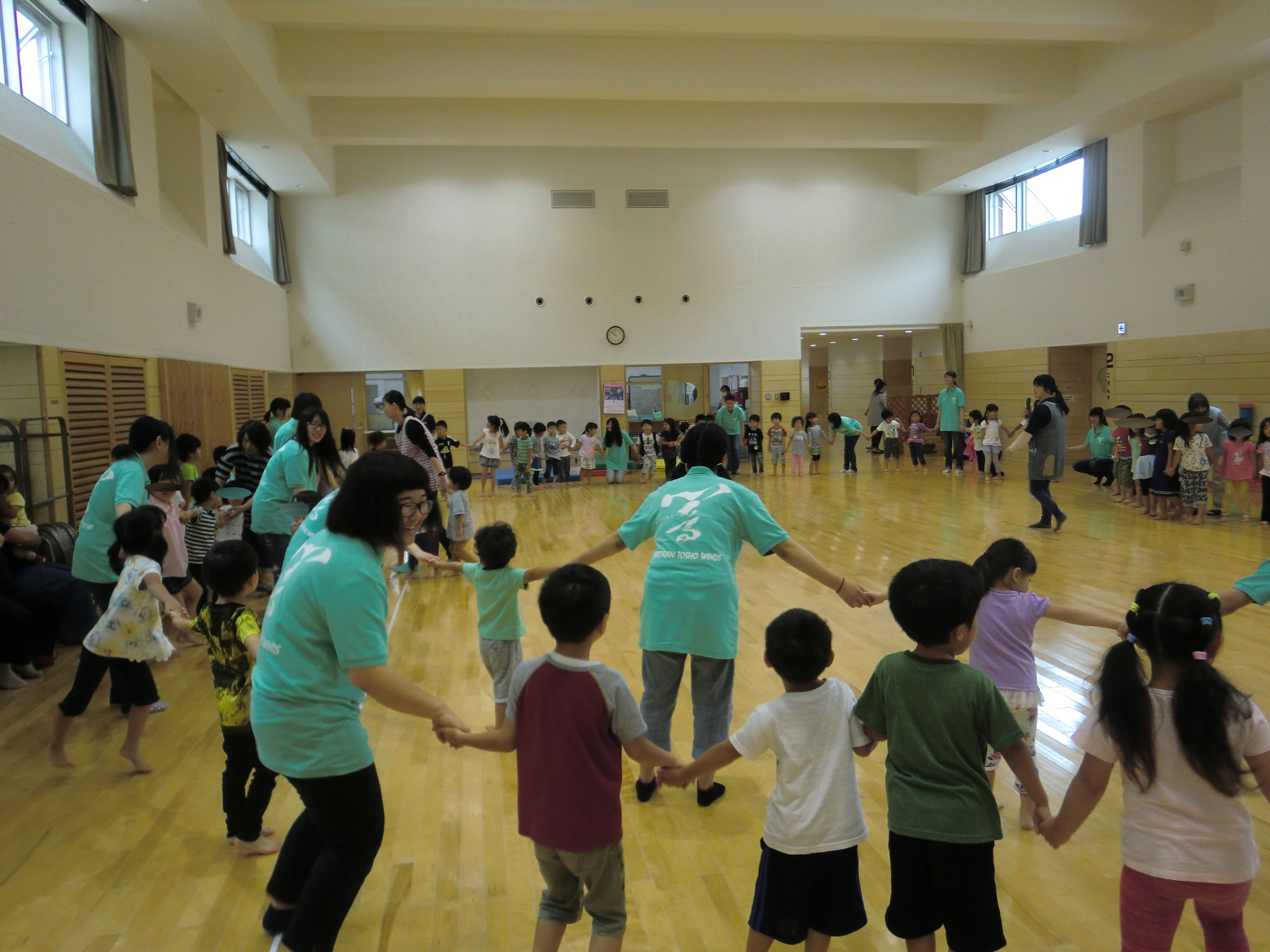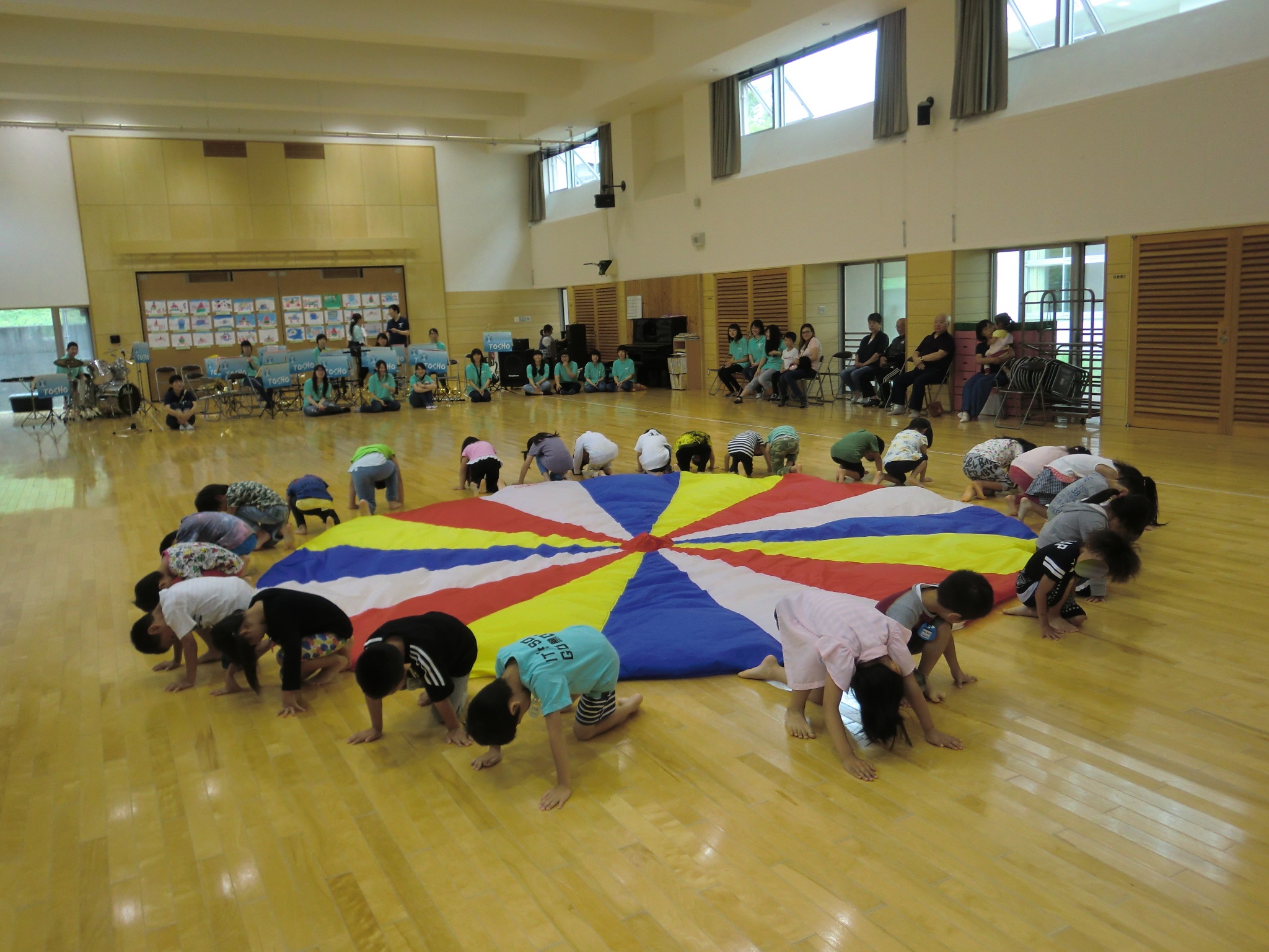 お兄さんお姉さんがやってきたよ! 保育園では毎年、東翔高校のブラスバンド部と交流しています。保育園のすぐ近くにある東翔高校はお散歩でも馴染みの学校です。 今年も、楽しい曲をいっぱい演奏してくれました。地域の方にも一緒に楽しみました。アンコールに「恋ダンス」を演奏してくれたので子ども達も大喜び。お返しにさくらさんがバルーンを演技してみせ、それから全員一緒に「妖怪村の夏祭り」を踊って楽しみました。