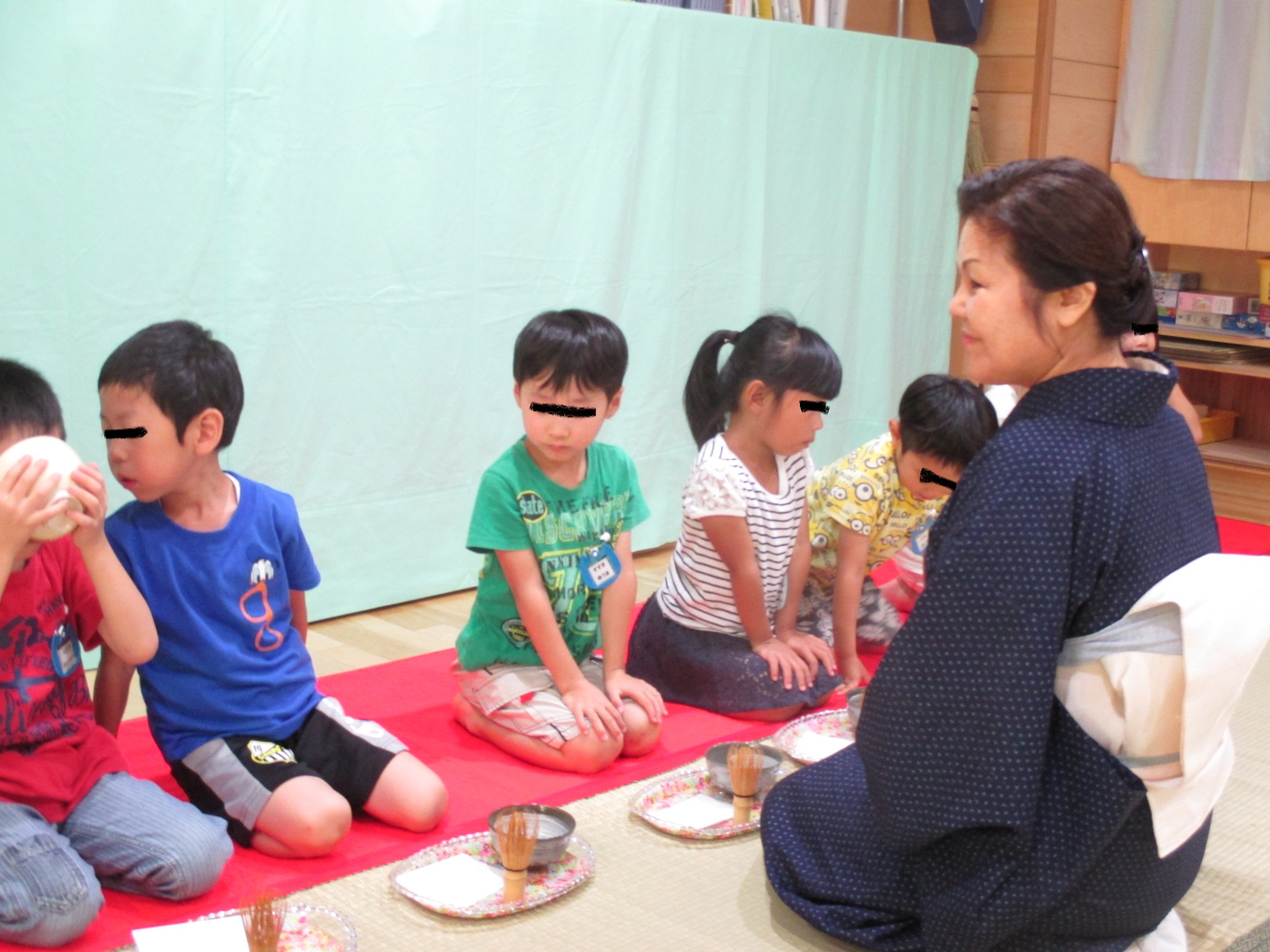 「お茶ごっこ」2回目です 6月15日以来の「お茶ごっこ」(茶道体験)です。今日は自分の点てたお茶をいただくという経験が目的です。 まず、お菓子をいただいて・・(羊羹とお干菓子でした) 次に自分でお茶を点てました。みんな真剣な顔で茶筅を動かしました。 さあ、自分が立てたお茶は美味しかったかな?