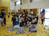 節分豆まき会がありました。 各クラスそれぞれが工夫して作ったお面を披露しあって、節分のお話を聞いた後、さくらさんが鬼役で登場、小さい子達は保育士にガードされて泣いています。毎年さくらさんはこの役を楽しみにしています。鬼めがけて新聞紙で作った豆が飛んできます。大人の鬼も出てきた後、福の神が登場してお菓子を運んできてくれました。それぞれのお部屋で、福の神が持って来てくれたお菓子を使って宝探しをして、みんなでいただきました。