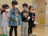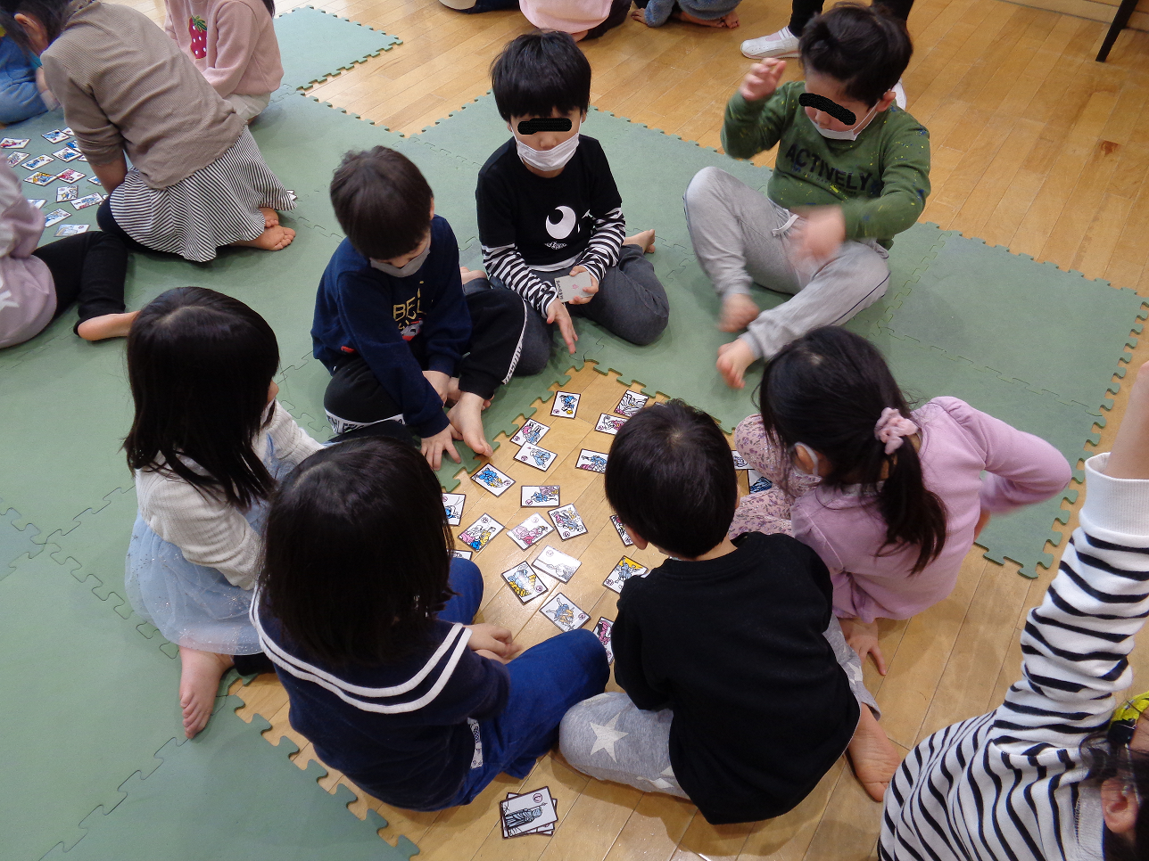 1月25日は1月の誕生会があり、かるた大会がありました! 小さいクラスは「たべものかるた」、大きいクラスは「ばばばあちゃんかるた」「いろはかるた」「そうべいかるた」など、各クラスとも4~5グループに分かれて行いましたよ。普段から部屋の中でお友達とかるたをして遊んでいる子ども達は、読み札が読み終わる前からかるたをとる姿も見られていました。3~5歳は表彰式も行われ、1位から3位の子ども達はメダルをもらい、嬉しそうな表情をしていましたよ!