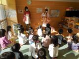 豆まきのあとはホールに集まり、節分の由来を聞いたり、各クラスの代表が前に出て自分で作ったお面の紹介をしたりしました。代表者は一番難しかったところ、頑張ったところなどを発表していましたよ。