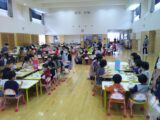 子ども達が製作した作品を、各クラスの代表者が前に出て紹介しました。大きなクラスでは、製作するときに難しかった所なども説明していました。